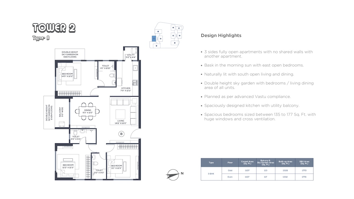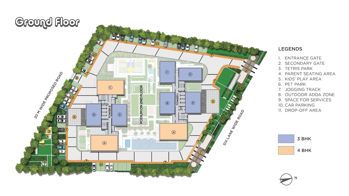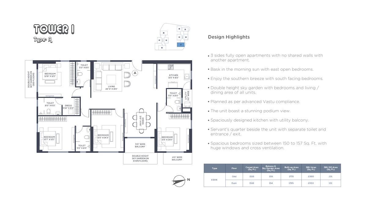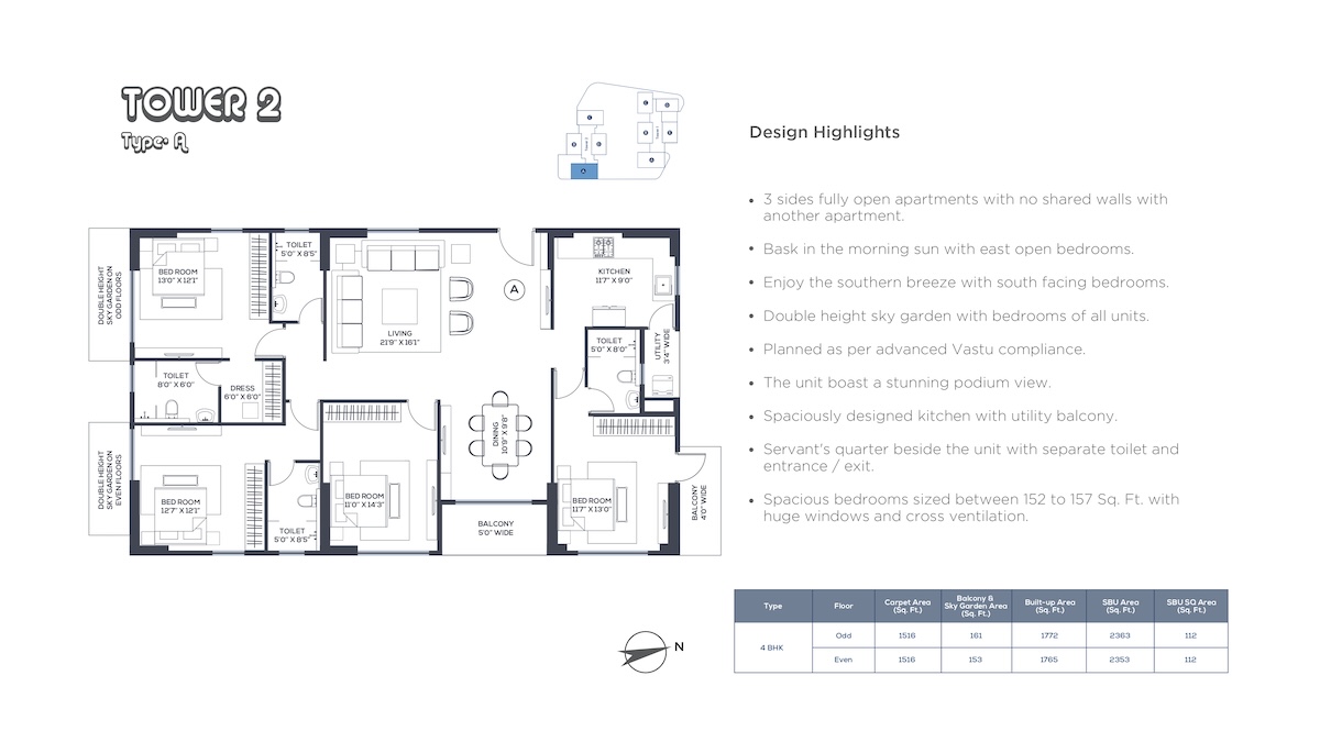 The project boasts Vaastu-compliant 3 and 4 BHK homes, each featuring its own double-height sky garden and 3 sides open units, bringing together convenience, security, and efficient space solutions.